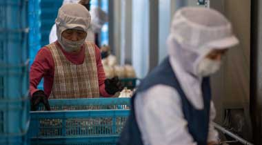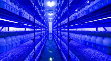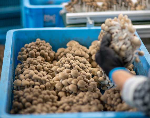光を照射し、きのこの傘の形成をつくり、きのこにします。そして、きのこを丁寧に摘み取ります。異物の混入がないか徹底したチェックを行います。