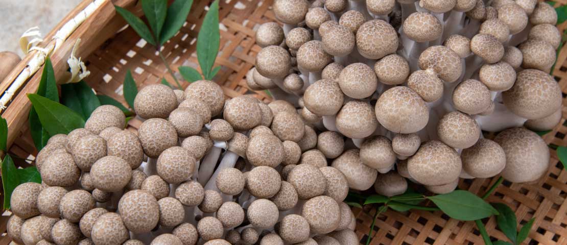 ぶなしめじは、自然界ではブナの枯れ木や倒木から発生するキシメジ科シロタモギタケ属のきのこで、傘色は類白色~淡褐灰色、表面頂部に大理石模様を有することが大きな特徴です。味は淡白で、本来は旨みと共に多少の苦味を有してはいるが、大変に歯ごたえがあって美味しいきのこです。